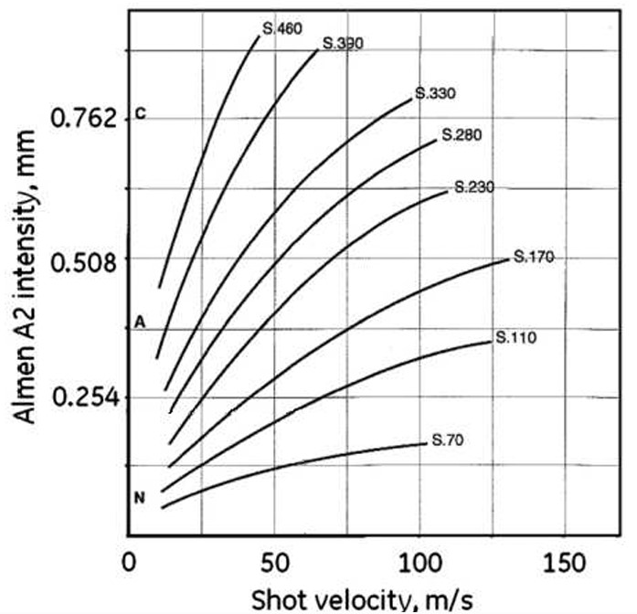 Il fenomeno della pallinatura, o shotpeening, è molto più complesso di quanto possa apparire a prima vista. In Figura 1b è schematizzato il meccanismo di contatto localizzato tra il pallino ed il materiale (pressione di Hertz) che provoca deformazioni plastiche e allungamento degli strati superficiali, generando così campi di compressione residua che si distribuiscono in profondità nel materiale. Nella stessa immagine è anche rappresento come il passaggio da un singolo ad una miriate di pallini modifichi in modo significativo il profilo di tensioni residue nel materiale. In Figura 1c invece è mostrato un esempio di come l’intensità dell’impatto (misurato convenzionalmente in Almen) è legato a fattori multipli, come, ad esempio, velocità e dimensione dei pallini. Anche solo attraverso questi semplici esempi si comprende immediatamente come nella pallinatura risulti essenziale comprendere l’influenza singola o combinata dei parametri di processo e riuscire a determinarne i valori ottimali.