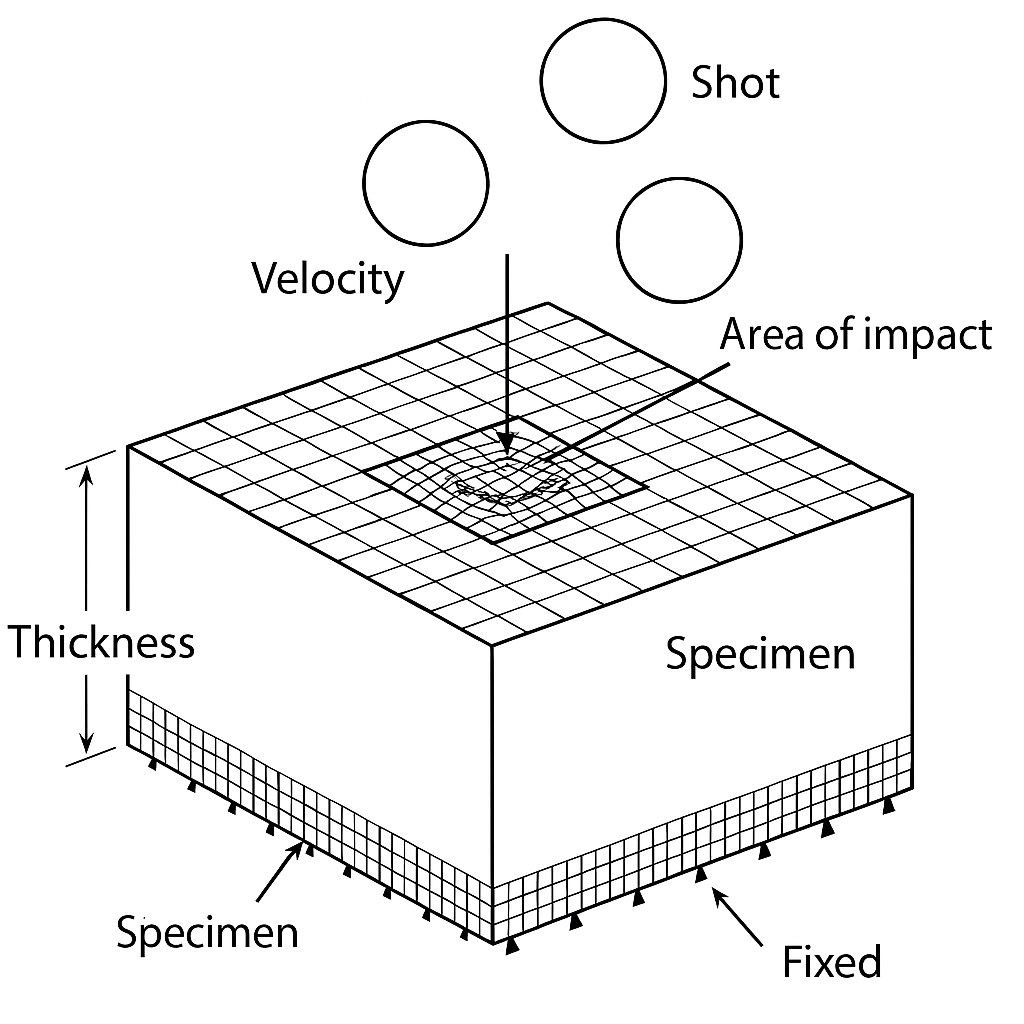 Il modello di Johnson–Cook è uno dei più utilizzati per descrivere il comportamento plastico dei metalli sottoposti a carichi dinamici, alte velocità di deformazione e condizioni termiche variabili. È particolarmente adatto a processi come la pallinatura, l’impatto balistico, la lavorazione ad alta velocità e le simulazioni FEM di crash o urti localizzati.