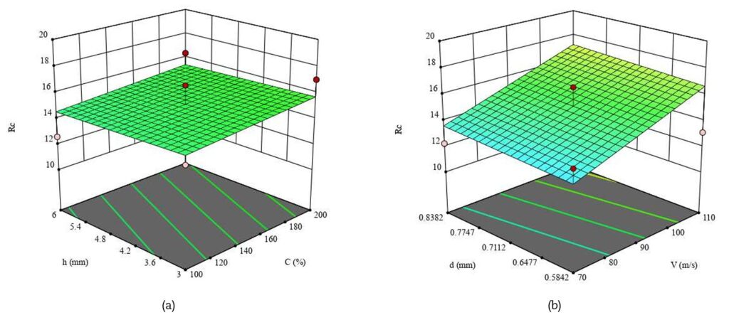 Dall’analisi delle superfici di risposta (RSM) emerge con chiarezza come i diversi parametri di processo influenzino gli esiti della pallinatura. La tensione residua superficiale aumenta al crescere della copertura, mentre tende a ridursi con lo spessore del pezzo, risultando invece poco sensibile alla velocità e al diametro dei pallini (Fig. 3). Diversamente, la tensione residua massima interna è fortemente condizionata dalla copertura e dal diametro dei pallini, mentre la velocità ha un effetto trascurabile (Fig. 4). La profondità a cui si colloca questa massima compressione dipende in modo diretto sia dalla velocità sia dal diametro: incrementi di entrambi i parametri portano la compressione utile a spingersi più in profondità (Fig. 5). Ancora più complessa è la situazione per la profondità complessiva dello strato compresso, governata da tutti i parametri analizzati e in particolare dall’interazione tra velocità e diametro (Fig. 6). Per quanto riguarda le caratteristiche superficiali, sia la rugosità media Ra sia la rugosità Rc (picchi e valli) risultano dominate quasi esclusivamente dalla velocità dei pallini, che ne determina un aumento progressivo (Figg. 7–8).