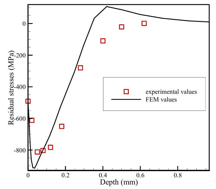 La Tabella 2 riassume i principali risultati dell’analisi ANOVA, mostrando in modo complessivo come i parametri fondamentali del processo di pallinatura (velocità, diametro, copertura, spessore) abbiano una influenza diretta su tensioni residue, profondità degli strati compressi e rugosità superficiale. Per quanto lo studio si sia concentrato sulle sole simulazioni, i risultati del modello sono stati confrontati con misure sperimentali di tensioni residue ottenute tramite diffrazione a raggi X e rimozione elettrolitica di strati. La corrispondenza – verificata alle condizioni (i) Shot S170, (ii) Intensità Almen 14A (equivalente a una velocità di 67,7 m/s), (iii) Copertura 100%, (iv) Angolo di impatto 90°, con coefficiente di attrito μ = 0,2 tra i pallini e la superficie durante il contatto – è risultata soddisfacente (Figura 9), confermando l’affidabilità delle simulazioni numerica e la validità della procedura statistico.