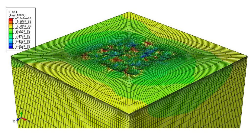 Le simulazioni sono state svolte con il software di analisi ABAQUS, impiegando un modello tridimensionale esplicito capace di catturare gli effetti dinamici dell’urto. L’obiettivo era simulare gli urti successivi dei pallini sulla superficie metallica, così da calcolare come si generano le tensioni residue e come varia la qualità superficiale del componente. Per ridurre le oscillazioni numeriche indesiderate sono stati introdotti opportuni coefficienti di smorzamento, in modo da ottenere risultati stabili e affidabili.