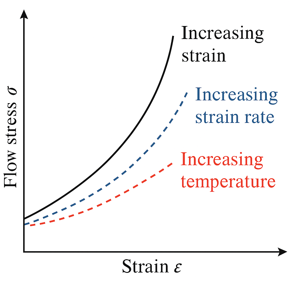 Figura 11. Andamento qualitativo della tensione di flusso (σ) secondo il modello di Johnson–Cook.