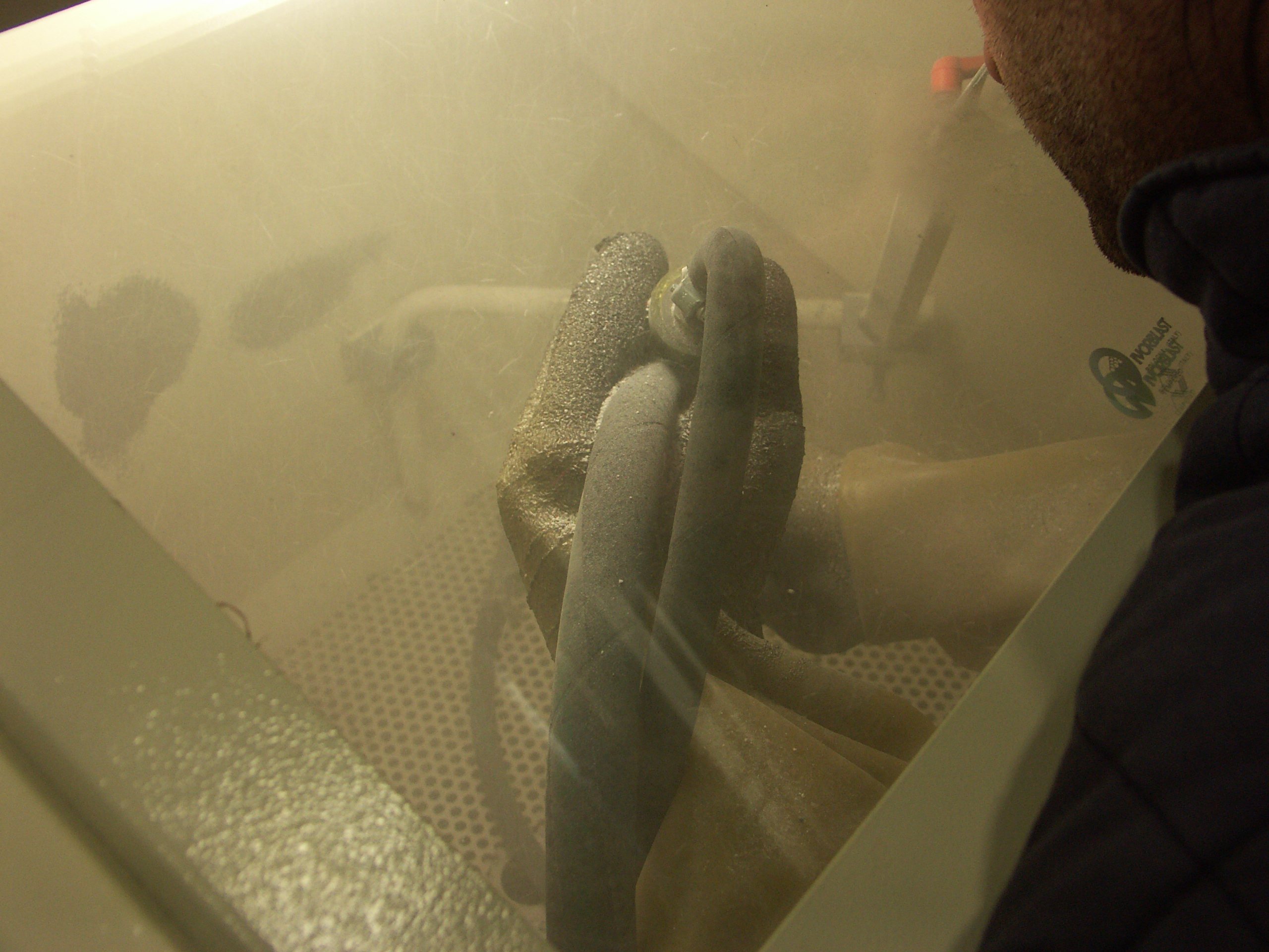 Figura 1. Alcuni dettagli sul processo di pallinatura: (a) esempio di procedura manuale (presso Norblast S.r.l.);  (b) effetto della pallinatura con creazione di uno strato deformato; (c) relazione tra l’intensità del trattamento (espresso in Almen) e la velocità dei pallini rispetto alle loro diverse dimensioni.