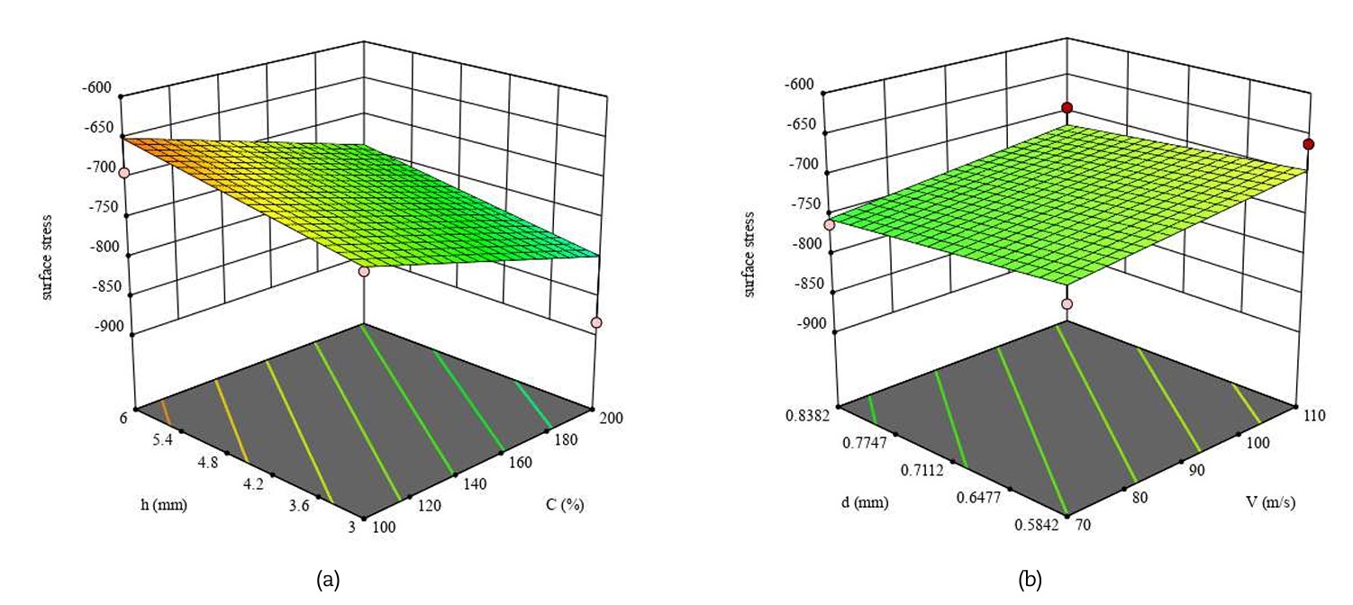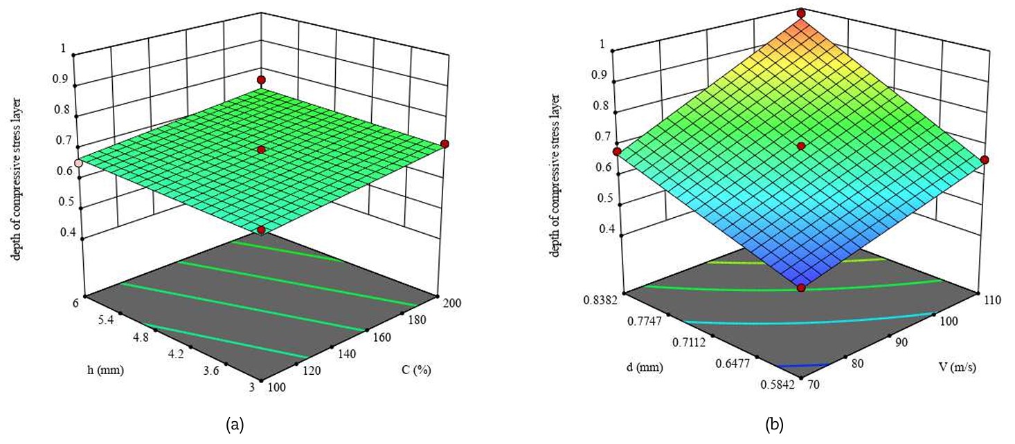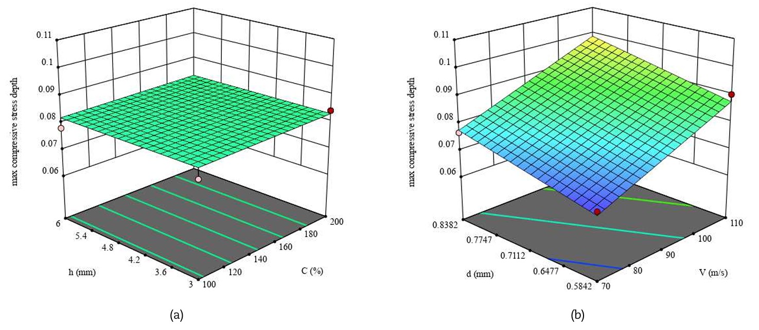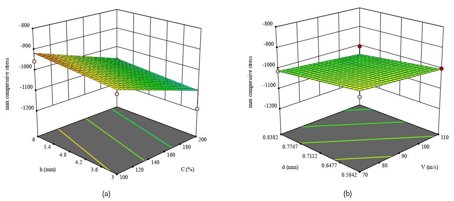 1. Tensioni residue superficiali: le tensioni compressive sulla superficie non dipendono in modo significativo né dalla velocità né dal diametro dei pallini, ma sono fortemente influenzate dalla percentuale di copertura e dallo spessore del pezzo. In pratica, aumentando la copertura si incrementa la compressione, mentre uno spessore maggiore tende a ridurne l’intensità superficiale.