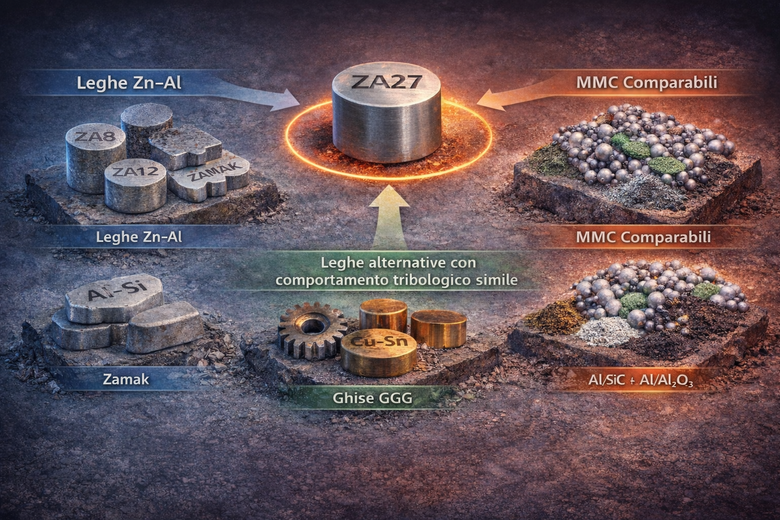 In termini generali, i compositi a matrice metallica (MMC) mostrano proprietà meccaniche superiori rispetto alle leghe non rinforzate, quali maggiore resistenza a trazione, incremento del modulo elastico e migliore stabilità alle alte temperature. Anche le leghe ZA rinforzate rientrano in questo quadro, beneficiando dell’apporto delle particelle disperse nella matrice. Tuttavia, esse presentano peculiarità specifiche, in particolare sotto il profilo tribologico e microstrutturale, che le distinguono nel più ampio panorama dei MMC.
