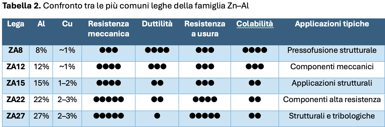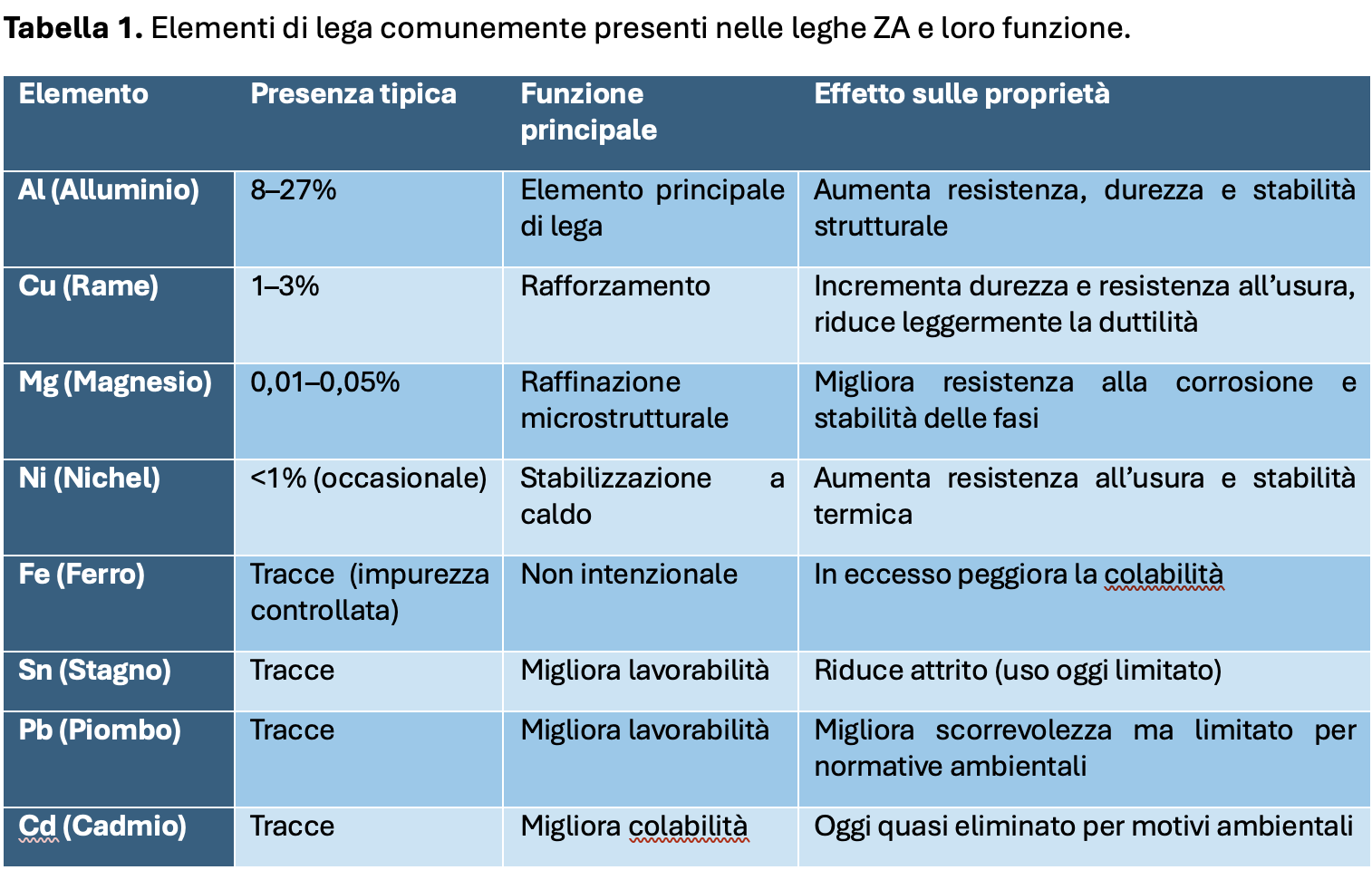 Le leghe zinco–alluminio (ZA) sono sistemi progettati per offrire un equilibrio tra proprietà meccaniche, processabilità e costo (Tabella 1). L’alluminio rappresenta l’elemento principale di lega, responsabile dell’incremento di resistenza e durezza rispetto allo zinco puro. Il rame, presente in percentuali moderate, contribuisce ulteriormente al rafforzamento e migliora la resistenza all’usura, mentre piccole aggiunte di magnesio favoriscono la stabilità microstrutturale e la resistenza alla corrosione. Altri elementi, come nichel o stagno, possono essere introdotti in quantità limitate per ottimizzare specifiche prestazioni, mentre ferro, piombo e cadmio sono generalmente presenti solo come impurezze controllate. La combinazione e il dosaggio di tali elementi consentono di modulare le proprietà della lega in funzione delle esigenze applicative, in particolare nei contesti in cui sono richieste buone prestazioni tribologiche.