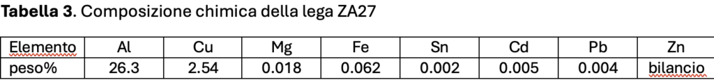 La sigla ZA27 identifica una lega zinco–alluminio contenente circa il 27% in peso di alluminio. All’interno della famiglia ZA, essa rappresenta la variante con le migliori prestazioni in termini di resistenza meccanica e durezza, a fronte tuttavia di una ridotta duttilità rispetto alle leghe ZA8 e ZA12. Il più elevato contenuto di alluminio comporta inoltre un aumento del punto di fusione, rendendola meno indicata per processi di pressofusione tradizionale, ma particolarmente adatta per applicazioni che richiedono elevata resistenza strutturale e stabilità nel tempo. Nonostante le buone proprietà meccaniche, l’impiego della ZA27 può risultare limitato in ambito tribologico, a causa di una resistenza all’usura non sempre adeguata in condizioni operative severe (Tabella 2).