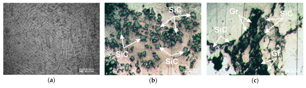 La Figura 2b mostra la microstruttura del composito ZA27/5%SiC, mentre la Figura 2c presenta la microstruttura del composito ibrido ZA27/5%SiC/3%Gr. Le particelle di SiC sono chiaramente distinguibili nelle immagini e rispetto alla grafite. Si osserva, in generale, una dispersione ragionevolmente omogenea delle particelle di rinforzo, che rappresenta uno degli elementi fondamentali per garantire un materiale di qualità. Tra l’altro, nelle immagini è anche possibile osservare come le particelle di grafite, più morbide, non sono riuscite a mantenere le proprie dimensioni originali per via dell’erosione subita durante il processo di miscelazione.