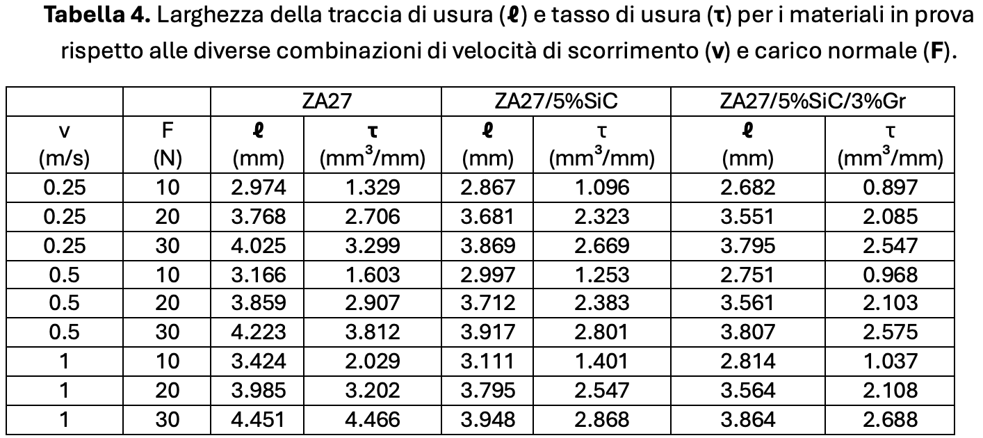 I dati sperimentali risultano in linea con quanto riportato in letteratura per la lega ZA27 e per i compositi a essa associati. In condizioni di scorrimento a secco, i materiali rinforzati mostrano sistematicamente una maggiore resistenza all’usura rispetto alla lega di base. Inoltre, per tutti i materiali analizzati, il tasso di usura evidenzia un incremento al crescere del carico normale applicato e della velocità di scorrimento.