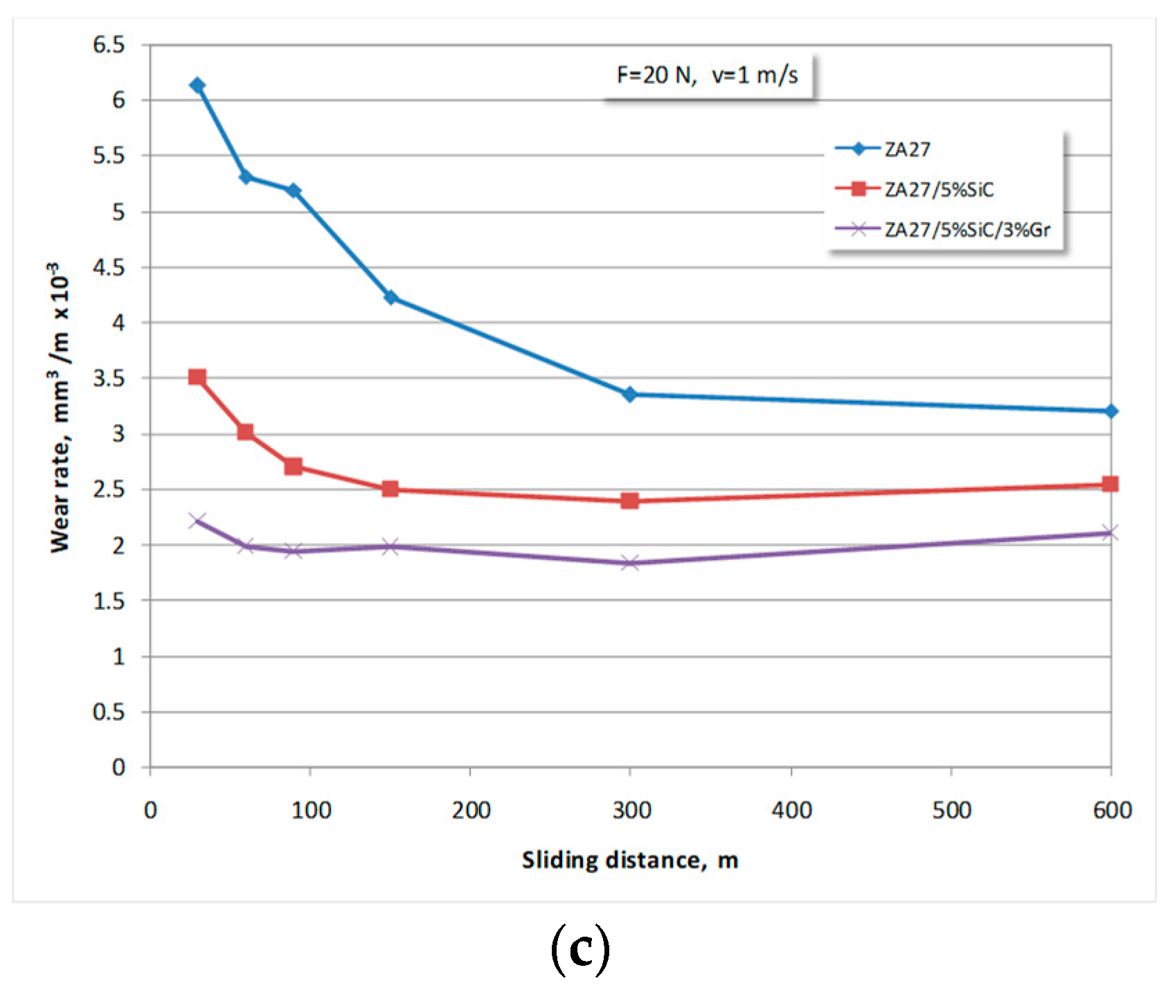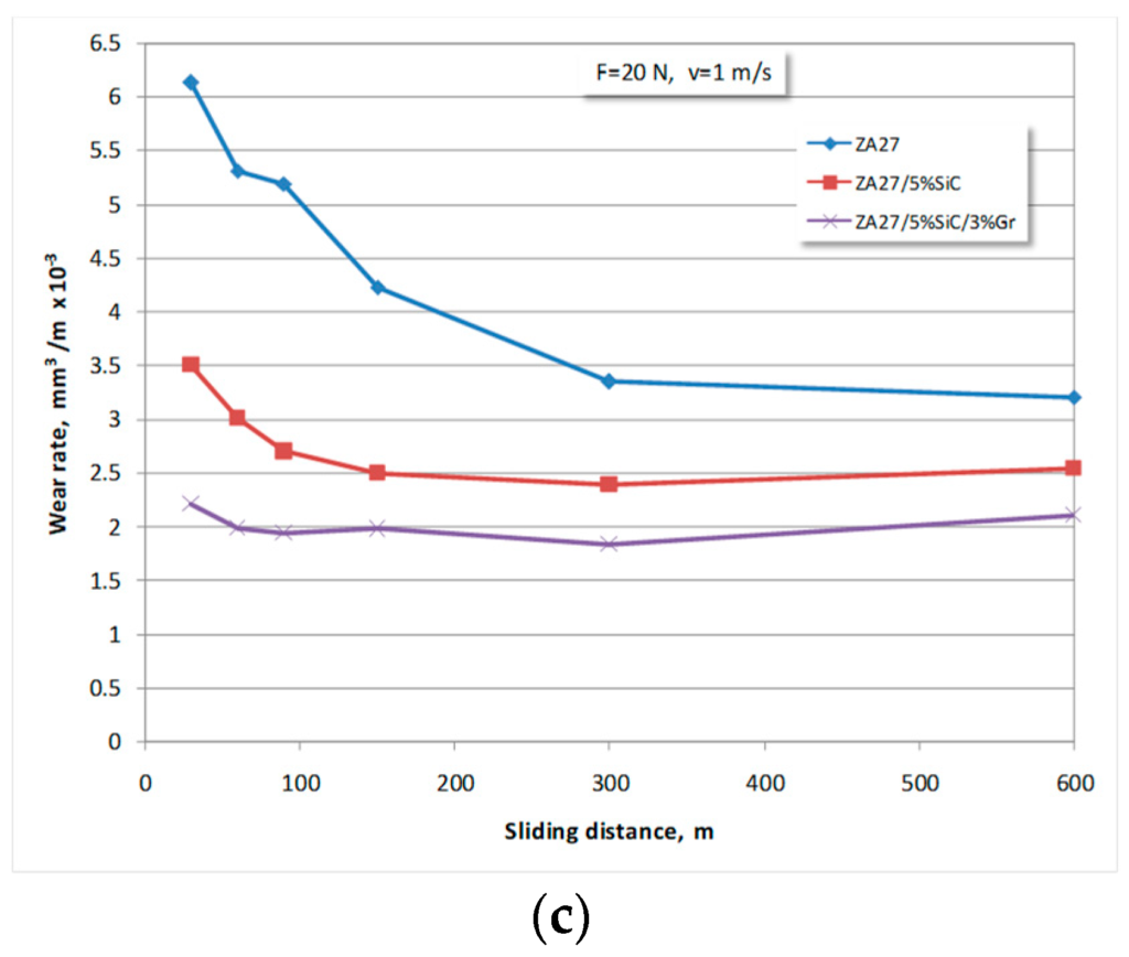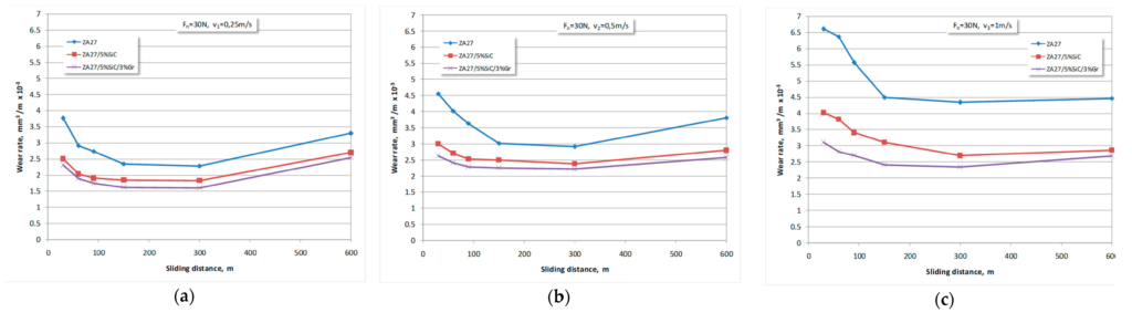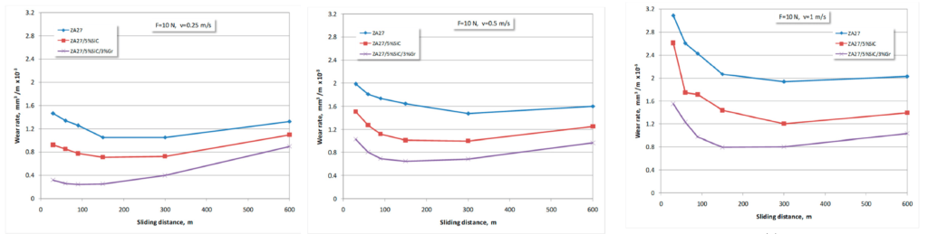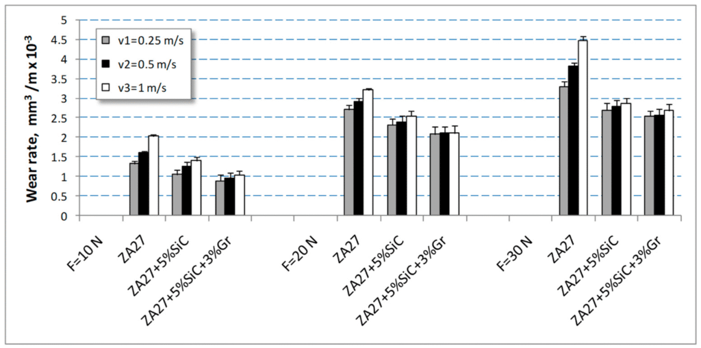 L’aggiunta di grafite alle leghe ZA non contribuisce unicamente al miglioramento di alcune proprietà meccaniche, ma introduce anche un marcato effetto di lubrificazione solida, con conseguente riduzione del tasso di usura. Tale comportamento è attribuibile alla formazione di un film superficiale di grafite nella zona di contatto, in grado di diminuire il coefficiente di attrito e limitare il danneggiamento del materiale durante lo scorrimento, sia in condizioni a secco sia in presenza di lubrificazione. Per tali ragioni, i compositi a base di ZA27 rinforzati con grafite risultano particolarmente idonei per applicazioni soggette ad attrito prolungato, dove sono richieste elevata durabilità e ridotte esigenze di manutenzione, come nel caso di componenti meccanici e sistemi automotive.