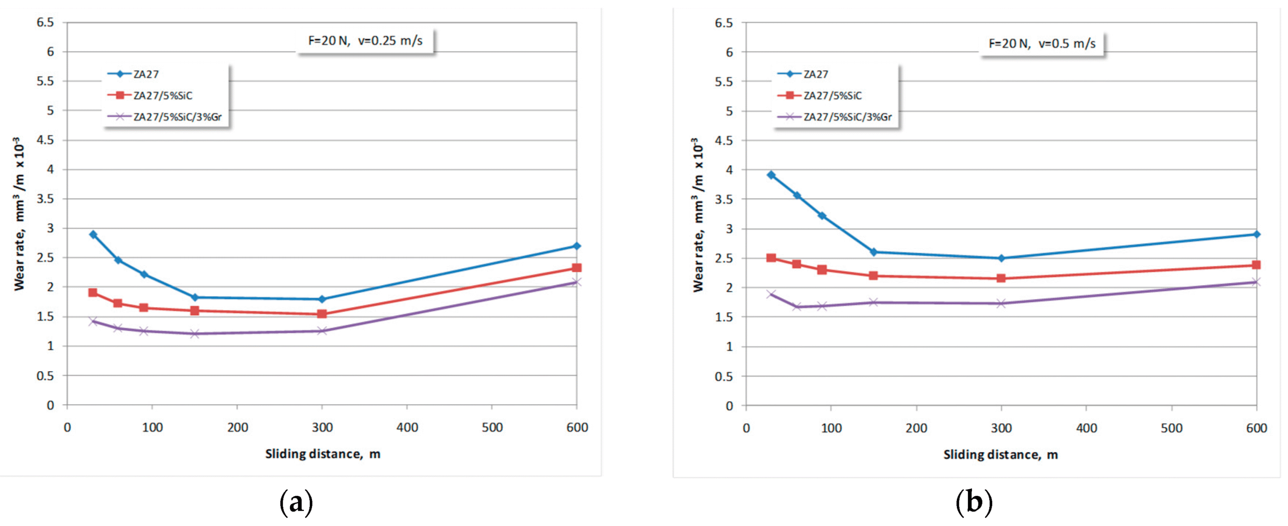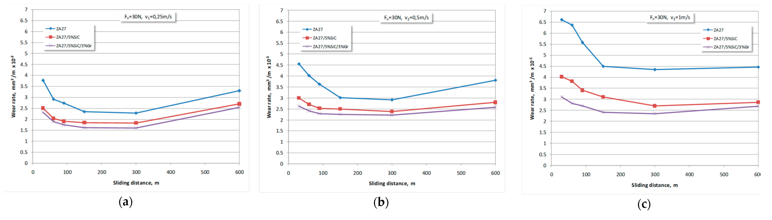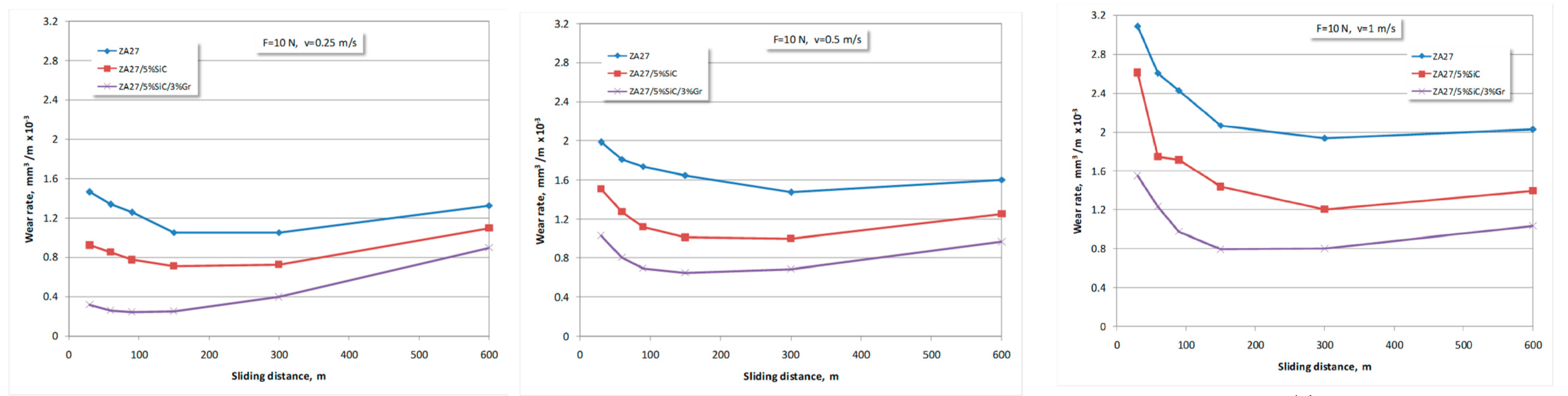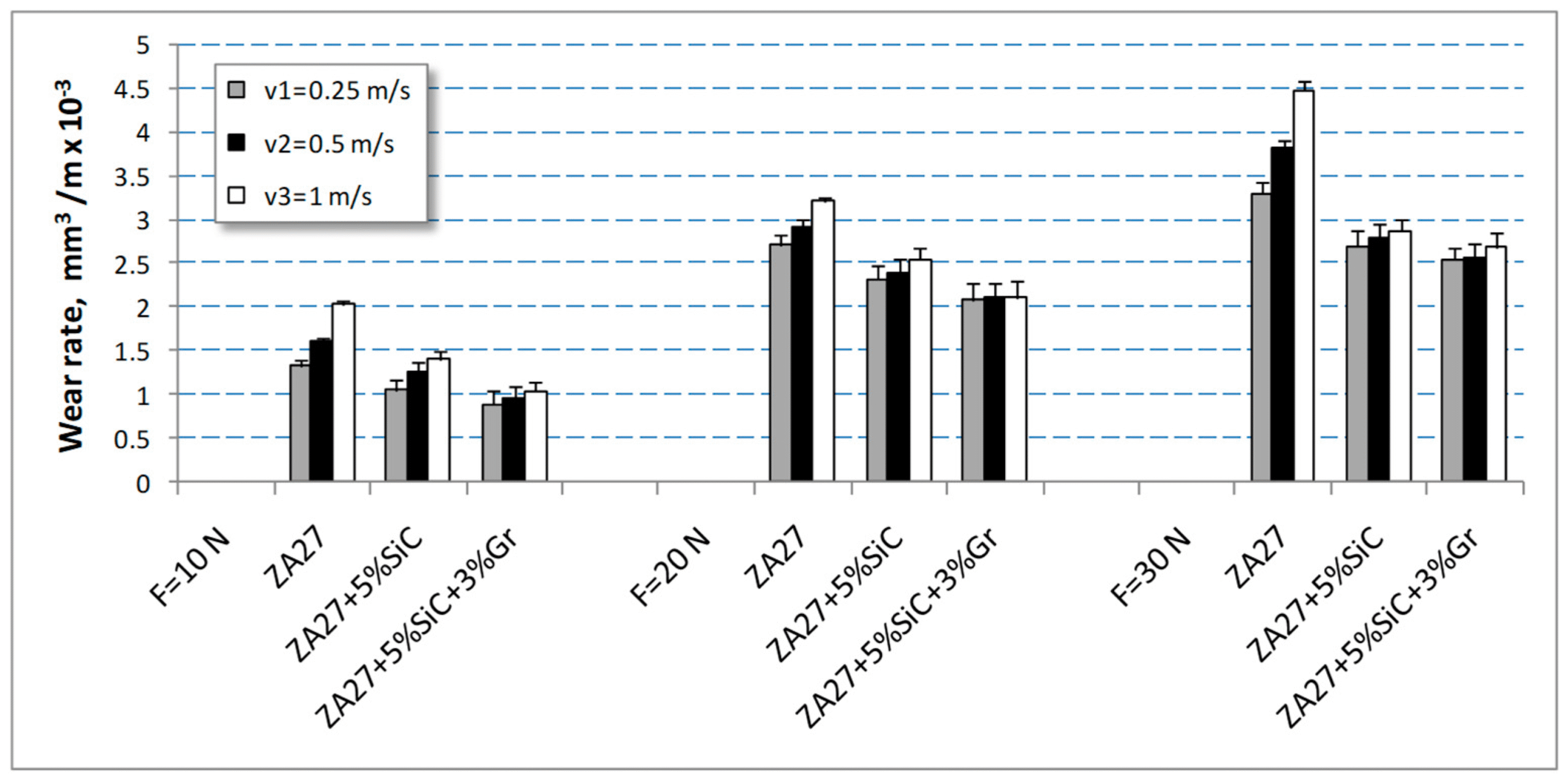 Per osservare l’evoluzione del processo di usura e facilitare i confronti, i risultati del tasso di usura (τ) per la lega ZA27 e i suoi compositi sono stati riportati negli stessi grafici. Per evidenziare chiaramente le differenze nei livelli di usura, i diagrammi sono stati realizzati considerando singoli valori di carico normale e velocità di scorrimento.