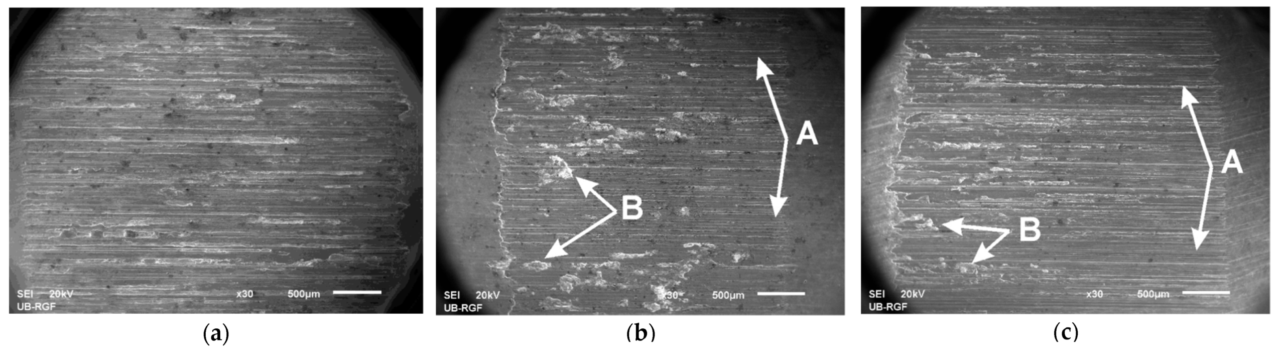 Ogni esperimento è stato ripetuto cinque volte per ciascun materiale e condizione di prova. La larghezza della traccia di usura sulla superficie di contatto del blocco è stata scelta quale parametro di riferimento per la misurazione dell’usura. La misura di questa larghezza è stata eseguita utilizzando un microscopio di misura universale UIM-21 (GOMZ, San Pietroburgo, Russia). I valori finali sono stati calcolati come media aritmetica di cinque misurazioni.