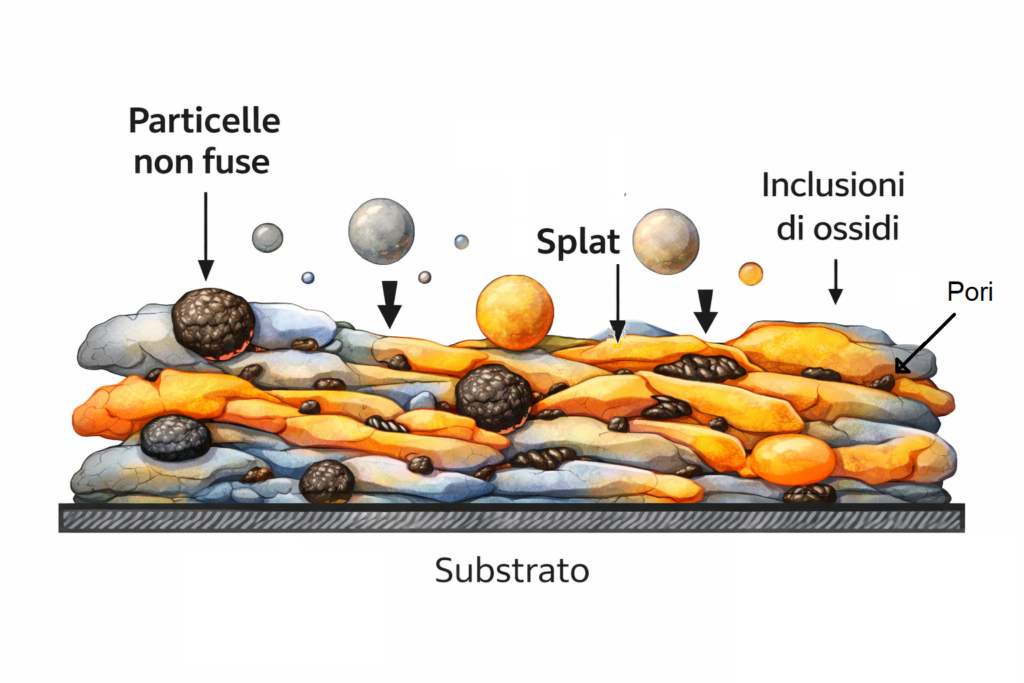 Se si osserva una tipica deposizione ottenuta con termospruzzatura, si nota che, oltre alle lamelle sovrapposte, sono presenti porosità, particelle non fuse e inclusioni di ossido, tipiche difettosità di questo genere di rivestimenti. Le porosità sono dovute all’inglobamento di gas nel coating, durante il processo di deposizione, mentre le inclusioni di ossido derivano sia dall’interazione fra le particelle e l’ambiente in cui avviene la spruzzatura, sia dal riscaldamento della superficie del deposito in via di formazione. All’atto dell’impatto il film d’ossido che ricopre la particella si rompe e rimane intrappolato tra le lamelle (fig. 2).