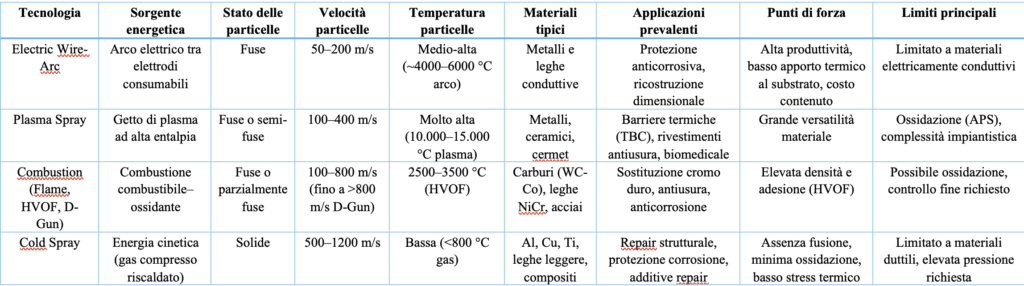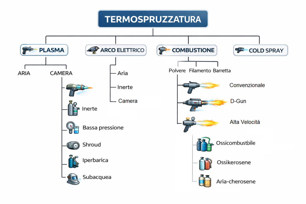 A seconda della sorgente termica impiegata nel processo di termospruzzatura, è possibile distinguere quattro principali tecnologie (fig. 3) e (Tab. 1):