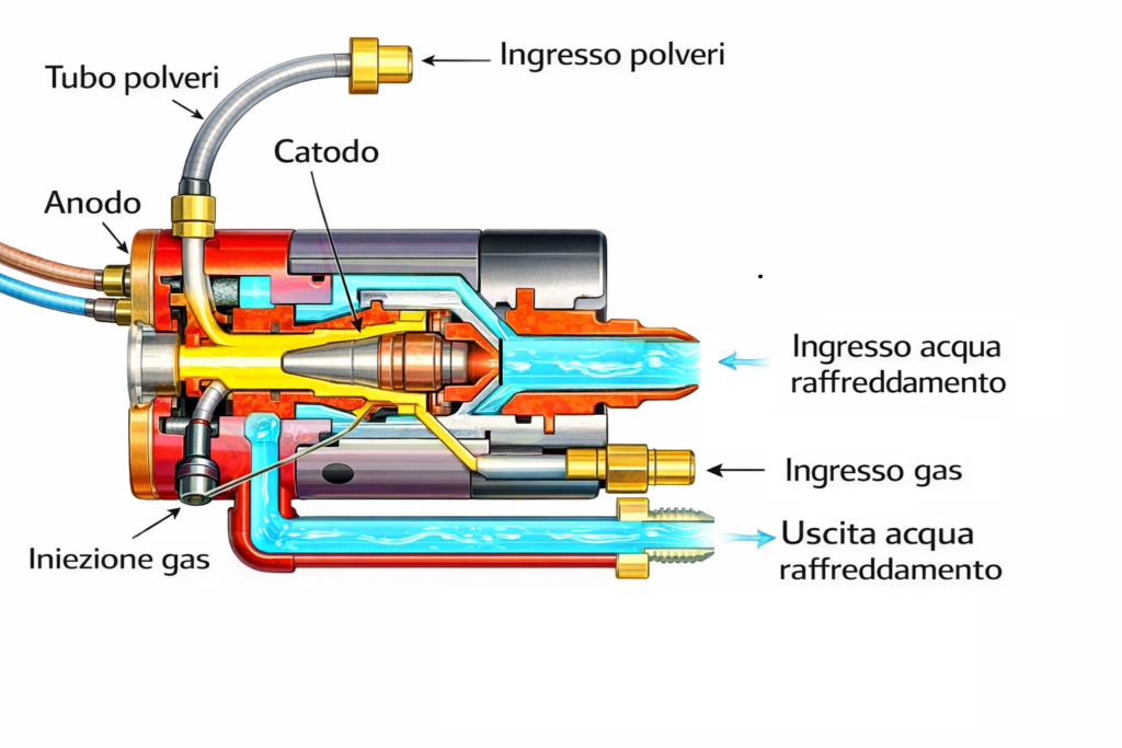 Il processo si basa sul trasferimento di potenza ad un flusso di gas che, acquistando entalpia ed energia cinetica, può successivamente cedere calore e quantità di moto alle polveri iniettate al suo interno. Sede della conversione di energia è una torcia costituita da due elettrodi, un anodo in rame a forma di imbuto ed un catodo in tungsteno conico, che insieme formano un condotto, generalmente convergente, all’interno del quale avviene l’efflusso del gas plasmogeno. Il trasferimento di potenza avviene per mezzo di un arco elettrico ad alta frequenza che viene generato fra i due elettrodi e che interagisce con il getto di gas propagandosi al suo interno e provocandone la ionizzazione: proprio la condizione di flusso provoca l’allungamento dell’arco che fuoriesce dalla torcia in forma di una fiamma al plasma (fig. 6).