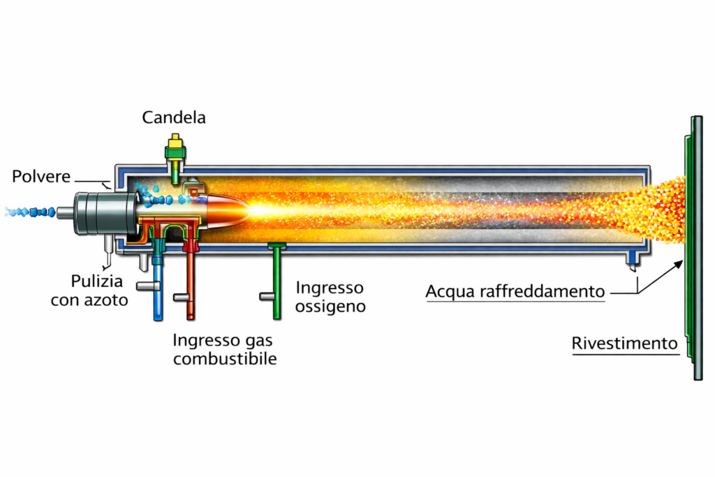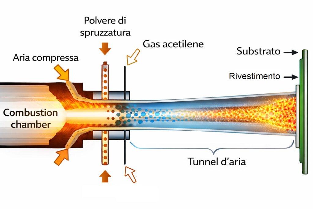 I processi di Combustion Spray costituiscono una delle principali famiglie della termospruzzatura nella moderna pratica industriale. Si basano sull’uso dell’energia chimica liberata dalla combustione controllata di una miscela combustibile–ossidante per generare un getto ad alta temperatura e velocità. In questi sistemi la conversione dell’energia chimica in energia termica e cinetica consente il riscaldamento e l’accelerazione delle particelle verso il substrato. A seconda della configurazione della torcia e delle condizioni operative, la componente termica o quella cinetica può risultare predominante, influenzando densità, ossidazione e adesione del rivestimento.