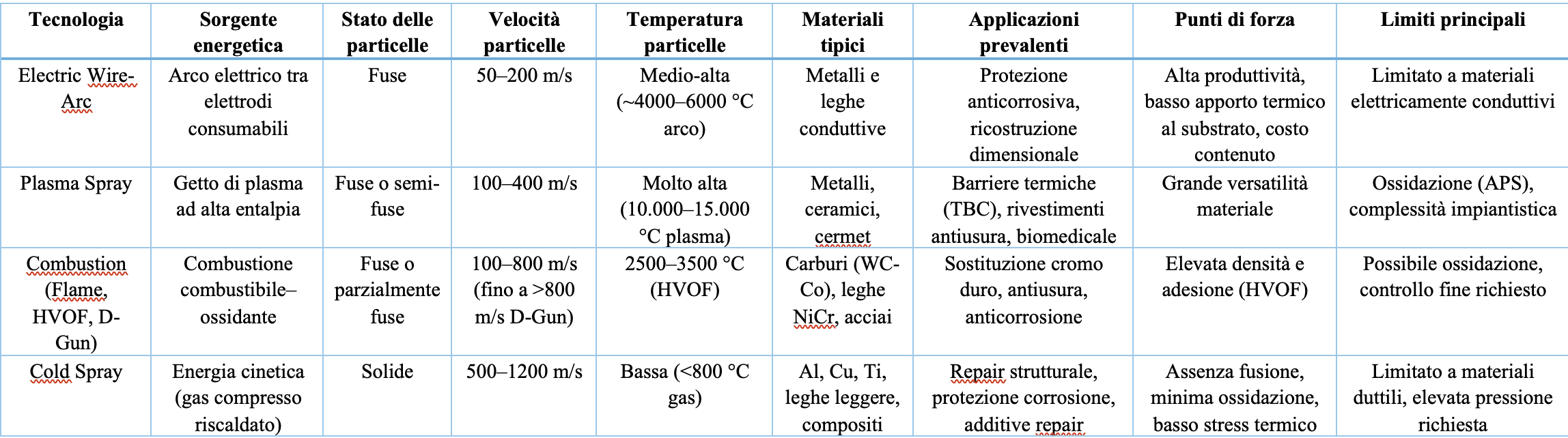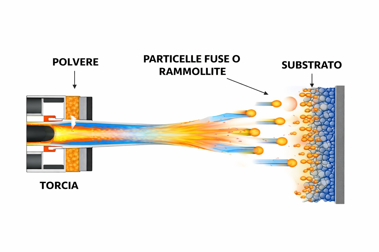 - Cold Spray, tecnologia di più recente sviluppo, nella quale le particelle vengono accelerate a velocità supersoniche in regime solido, consentendo la deposizione senza fusione significativa del materiale.