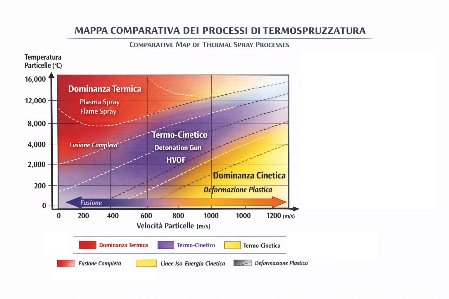 In fig. 4 è mostrata una prima rappresentazione dei processi di termospruzzatura basata sull’energia termica e cinetica trasferita alle particelle, utile per interpretare meccanismi di adesione, densificazione e difettosità del rivestimento. Entriamo ora più nel dettaglio dei singoli processi.