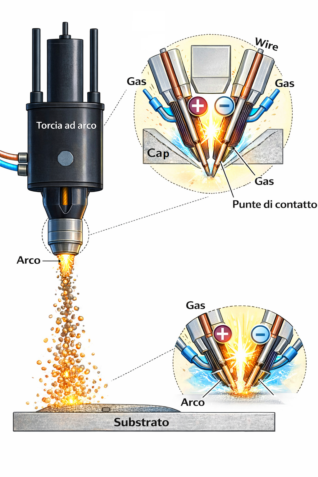 - Electric Wire-Arc, in cui il materiale d’apporto in filo viene fuso mediante un arco elettrico generato tra due elettrodi consumabili;