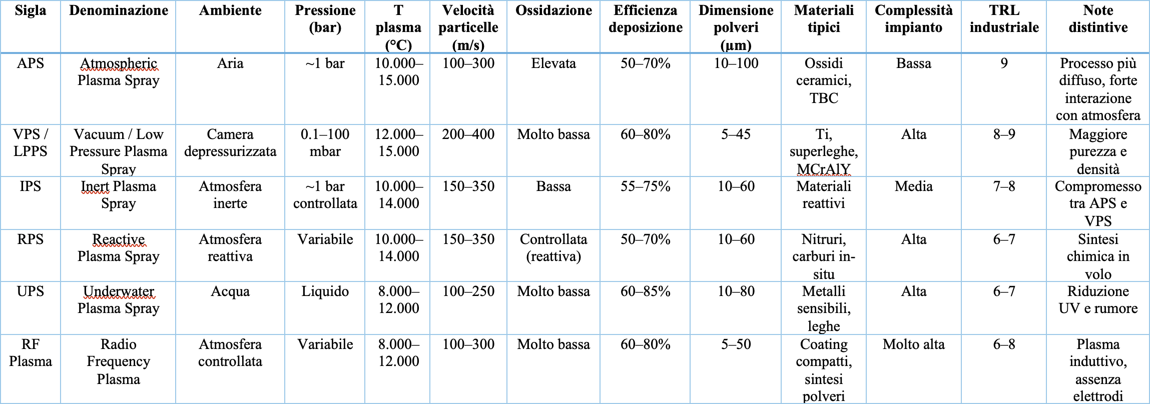 Esistono diversi tipi di plasma spray (Tabella 2), tra cui i principali sono: