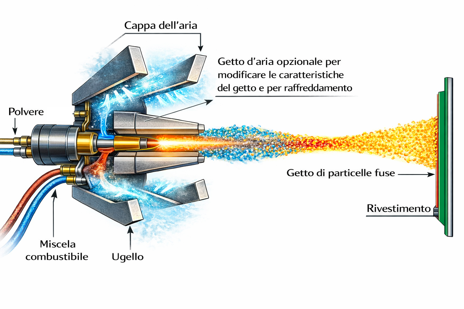 I processi di Combustion Spray costituiscono una delle principali famiglie della termospruzzatura nella moderna pratica industriale. Si basano sull’uso dell’energia chimica liberata dalla combustione controllata di una miscela combustibile–ossidante per generare un getto ad alta temperatura e velocità. In questi sistemi la conversione dell’energia chimica in energia termica e cinetica consente il riscaldamento e l’accelerazione delle particelle verso il substrato. A seconda della configurazione della torcia e delle condizioni operative, la componente termica o quella cinetica può risultare predominante, influenzando densità, ossidazione e adesione del rivestimento.