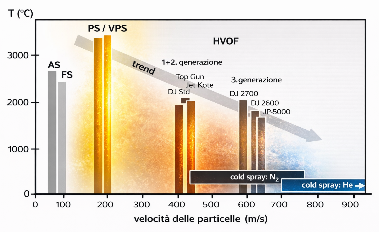 A seconda della sorgente termica impiegata nel processo di termospruzzatura, è possibile distinguere quattro principali tecnologie (fig. 3) e (Tab. 1):