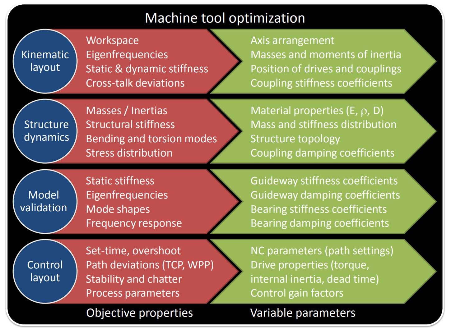 In figura 2 sono sintetizzati i principali ambiti di ottimizzazione delle macchine utensili meccatroniche; in particolare i legami tra le proprietà obiettivo (a sinistra) e i parametri variabili (a destra), suddivisi in quattro aree chiave del progetto: