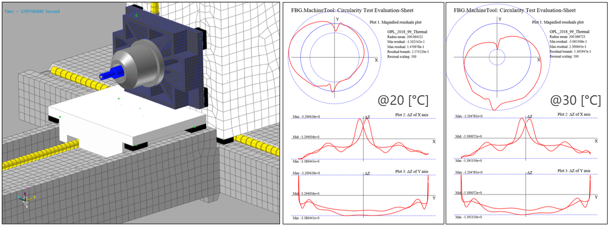 Nelle simulazioni dinamiche, la macchina è stata sottoposta a una traiettoria circolare rapida. L’errore di forma generato dall’aumento di temperatura ha mostrato un peggioramento progressivo: in condizione raffreddata, l’incremento è stato superiore al 100%, mentre in condizione riscaldata è stato osservato un deterioramento geometrico di oltre 900%, con alterazioni anche nel raggio medio della traiettoria.