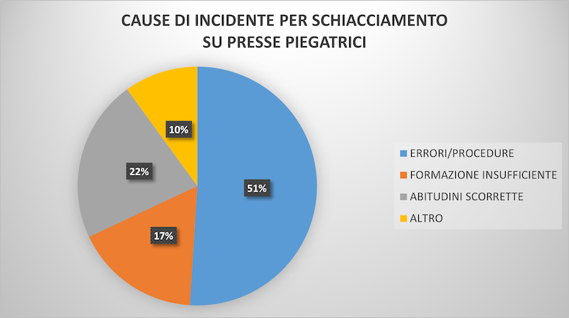 La pressa piegatrice rappresenta il simbolo di precisione e forza. Allo stesso tempo è una delle attrezzature più rischiose per l’operatore. Negli ultimi cinque anni il quadro che emerge dai dati Iinfor.Mo e Inail sorprende e invita a riflettere: oltre la metà degli infortuni gravi su queste macchine nasce da una stretta combinazione di fattori tecnici e comportamentali, troppo spesso sottovalutati. Lo schiacciamento di dita, mani o braccia risulta il tipo d’incidente nettamente predominante sulle presse piegatrici, con un impatto che può arrivare ad amputazioni permanenti. Tipiche sono le situazioni in cui l’arto resta imprigionato fra punzone e matrice oppure tra il pezzo in lavorazione e il fronte pressa. Il rischio cresce esponenzialmente durante operazioni di posizionamento, regolazione del pezzo o cambio utensili. Il 56,4% degli infortuni su presse è riconducibile proprio a dinamiche di schiacciamento, con traumi spesso di notevole gravità. Circa il 51% degli incidenti nasce da azioni improvvisate o errori nel rispetto delle procedure, come quando la mano non si ritira prontamente o manca coordinamento tra operatori. Il 22% dei casi è invece associato a abitudini scorrette consolidate nel tempo, mentre il 17% è dovuto a insufficiente formazione specifica.