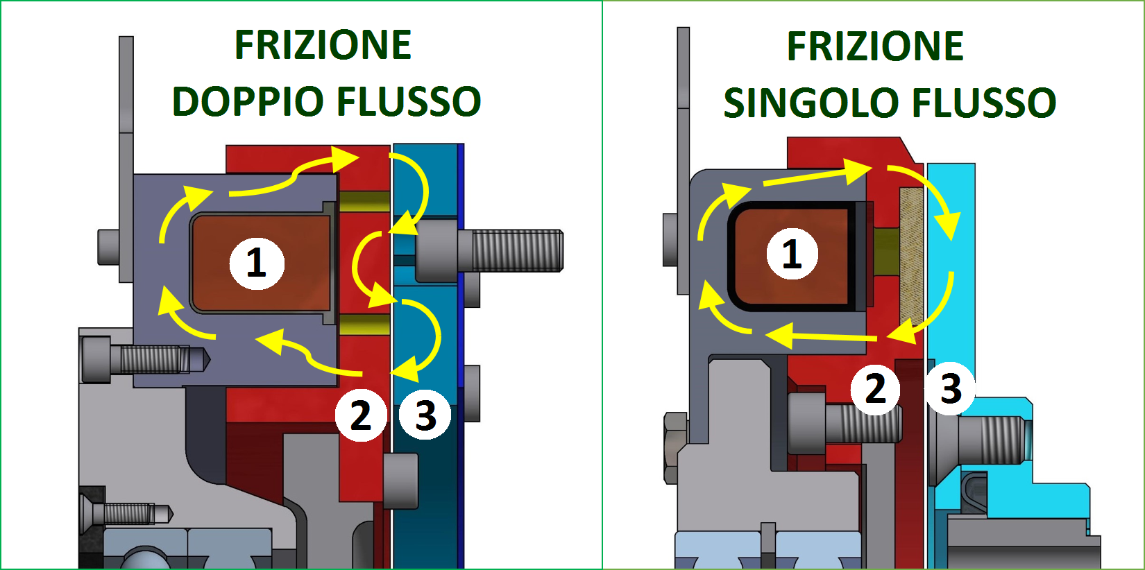 Che cosa sia e a cosa serva il doppio flusso magnetico ce lo spiega Alessio Martegani, Mechanical Engineer presso M.W.M.: «Utilizzando uno specifico design di armatura e rotore siamo in grado di effettuare un doppio passaggio del campo magnetico tra le due superfici di attrito. Questo ci permette, teoricamente, di raddoppiare la forza di attrazione, e di conseguenza la coppia, mantenendo invariate le dimensioni rispetto ad una frizione monodisco tradizionale. Inoltre, rimane ancora possibile eseguire l’innesto in movimento, grazie alla trasmissione di coppia per attrito».
