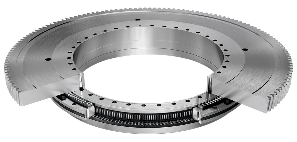 Per le tavole girevoli azionate, in particolare quelle che non vengono utilizzate per la lavorazione simultanea, si sta affermando la tendenza a utilizzare motoriduttori. Gli sviluppatori Schaeffler hanno messo a punto una soluzione innovativa per ridurre il notevole sforzo di progettazione degli assi rotanti con ingranaggi, lo spazio di installazione, la complessità e il tempo di montaggio: I cuscinetti per assi rotanti YRTC e YRTA possono essere ordinati con dentatura sul diametro esterno (YRTCG, YRTAG). La dentatura sostituisce così la corona dentata del cliente. A seconda della coppia richiesta, l’anello interno viene progettato con la larghezza appropriata e la dentatura cilindrica o elicoidale. Questa soluzione è ideale per l’azionamento di tavole di fresatura e assi orientabili di ponti di fresatura e teste di fresatura o assi di automazione. I sistemi di misurazione angolare AMOSIN possono essere integrati nei cuscinetti e sono ancora disponibili per questi cuscinetti.