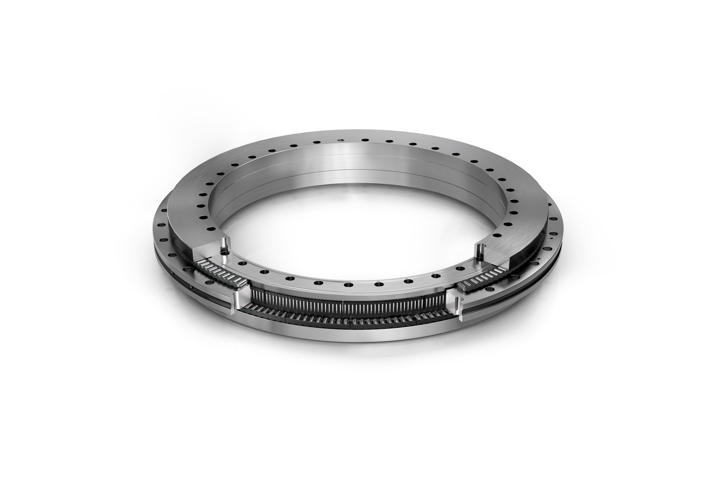 Per le tavole girevoli azionate, in particolare quelle che non vengono utilizzate per la lavorazione simultanea, si sta affermando la tendenza a utilizzare motoriduttori. Gli sviluppatori Schaeffler hanno messo a punto una soluzione innovativa per ridurre il notevole sforzo di progettazione degli assi rotanti con ingranaggi, lo spazio di installazione, la complessità e il tempo di montaggio: I cuscinetti per assi rotanti YRTC e YRTA possono essere ordinati con dentatura sul diametro esterno (YRTCG, YRTAG). La dentatura sostituisce così la corona dentata del cliente. A seconda della coppia richiesta, l’anello interno viene progettato con la larghezza appropriata e la dentatura cilindrica o elicoidale. Questa soluzione è ideale per l’azionamento di tavole di fresatura e assi orientabili di ponti di fresatura e teste di fresatura o assi di automazione. I sistemi di misurazione angolare AMOSIN possono essere integrati nei cuscinetti e sono ancora disponibili per questi cuscinetti.