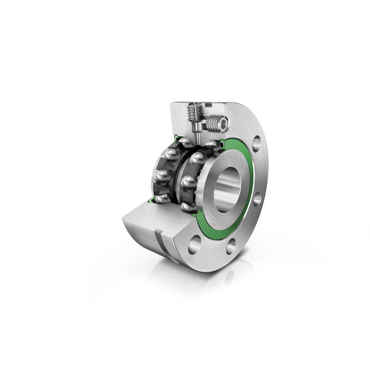 Per queste applicazioni, Schaeffler offre una soluzione semplice, pratica ed efficiente: i cuscinetti a sfere a contatto obliquo a due corone delle serie ZKLN e ZKLF (con montaggio a flangia) e la variante a tre corone DKFLA dotati di corpi volventi in ceramica. Queste esecuzioni offrono un’elevata affidabilità operativa con corse brevi e vibrazioni da fermo. La capacità di carico dinamico e la durata di vita calcolata dei cuscinetti non cambiano. L’uso di corpi volventi in ceramica raddoppia addirittura la durata di esercizio del grasso. Con questi cuscinetti si possono evitare in modo affidabile i tempi di fermo e gli interventi di assistenza causati da false brinellature.