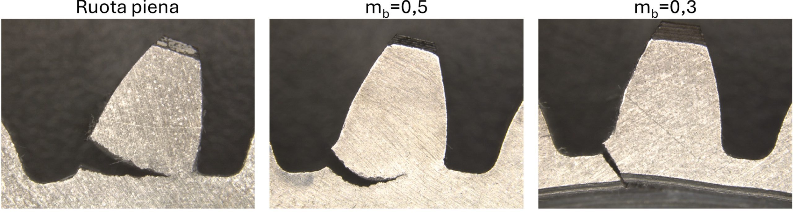 La figura 5 riassume i percorsi di propagazione delle cricche per i tre ingranaggi testati. I risultati mostrano che, per l’ingranaggio pieno e per quello con mb = 0,5, le cricche si sono propagate attraverso lo spessore del dente (guasto sicuro), mentre nell’ingranaggio con mb = 0,3, la propagazione è avvenuta attraverso la corona (guasto catastrofico).