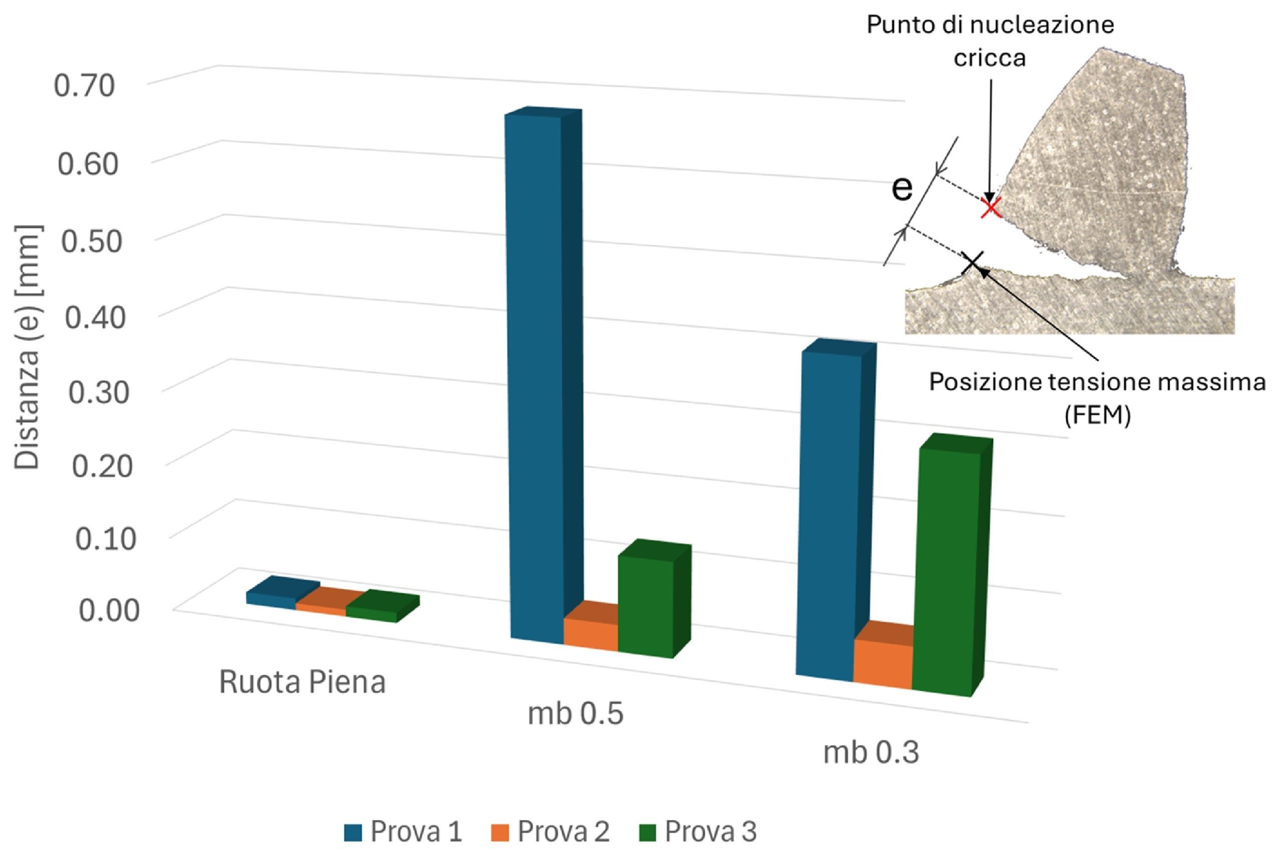 La figura 6 mostra quantitativamente la distanza tra i punti di innesco delle cricche ottenuti sperimentalmente e i punti di massima tensione calcolati tramite analisi FEM. Il confronto mostra che i punti di innesco delle cricche coincidono con le zone di massima tensione. Tuttavia, nella Prova 1 con mb = 0,5, si osserva un lieve scostamento tra il punto di innesco della cricca e la posizione prevista dal FEM.