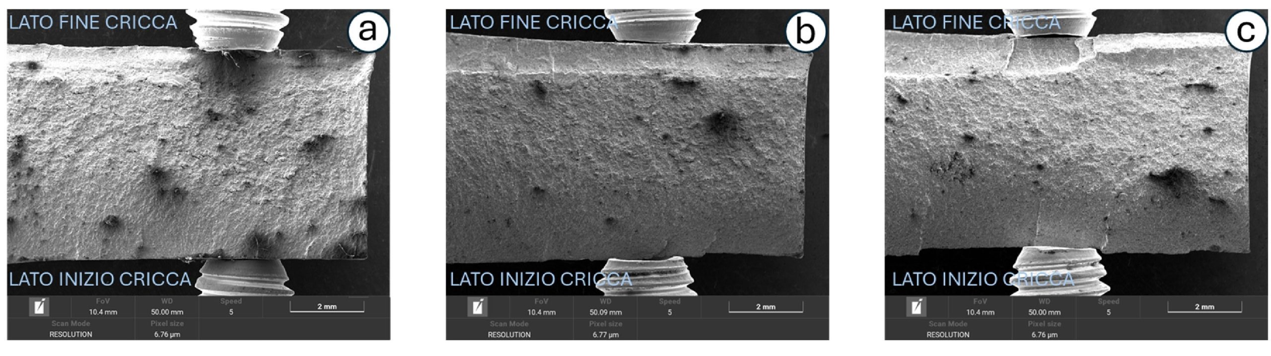 L’analisi al SEM ha ulteriormente confermato che le superfici di frattura rimangono irregolari a causa dell’azione di carichi pulsanti, che impediscono la chiusura della cricca e quindi l’effetto di levigatura tipico di condizioni di carico a media nulla.