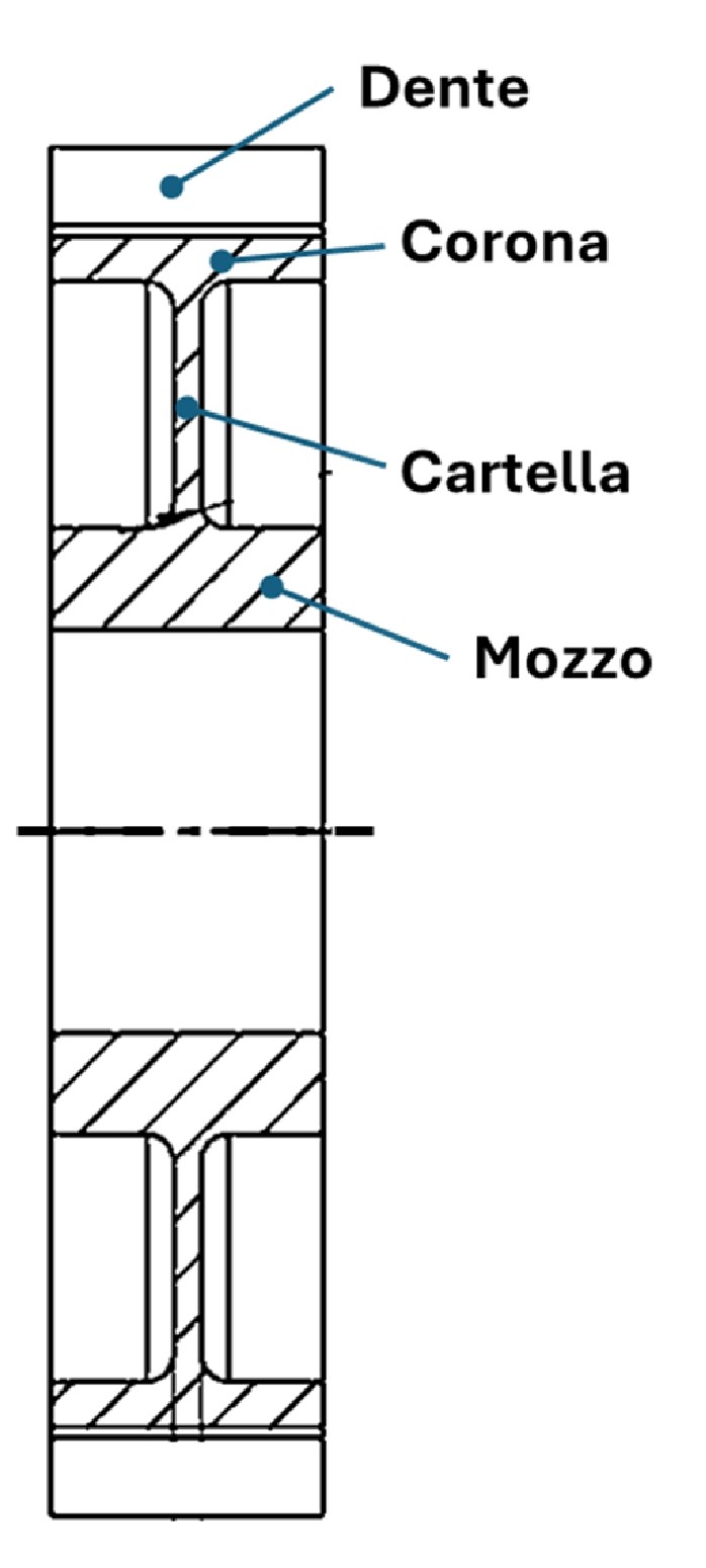 In questo lavoro sono stati esaminati tre ingranaggi realizzati in acciaio C55 (senza trattamenti superficiali o termici). I tre ingranaggi presentano la stessa geometria del dente (modulo = 3 mm, numero di denti = 32, angolo di pressione = 20°, assenza di spostamento di profilo, larghezza di fascia = 20 mm); l’unica differenza riguarda lo spessore della corona, variato per ottenere tre differenti valori di backup ratio.