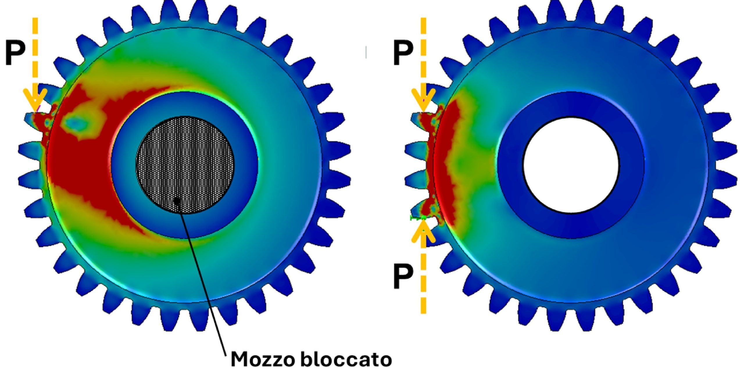 In particolare, il carico centrifugo provoca uno spostamento del punto di massima tensione (ossia il punto in cui si presume l’innesco della cricca) verso la radice del dente [8]. Di conseguenza, se la cricca si innesca in prossimità della radice del dente, aumenta la probabilità che essa si propaghi attraverso la corona.