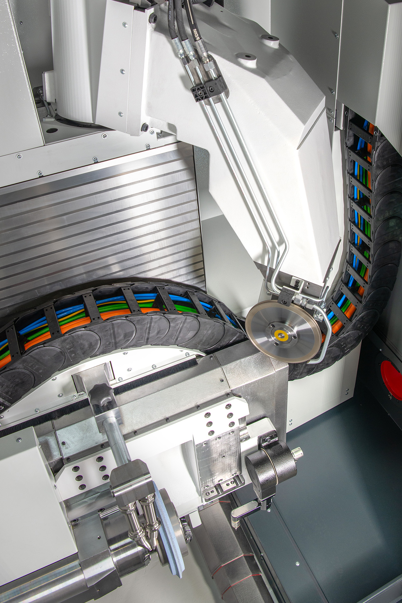 Modifiche complesse possono essere realizzate sulla KNG 5P expert attraverso una rettifica interpolata a 5 assi con asse basculante aperto, garantendo una lavorazione altamente produttiva e pressoché priva di interferenze nella rettifica a doppio fianco. Durante la rettifica di viti senza fine, il braccio di ravvivatura si ritrae completamente dall’area di lavoro della slitta di rettifica, consentendo di sfruttare appieno la corsa di 675 mm.