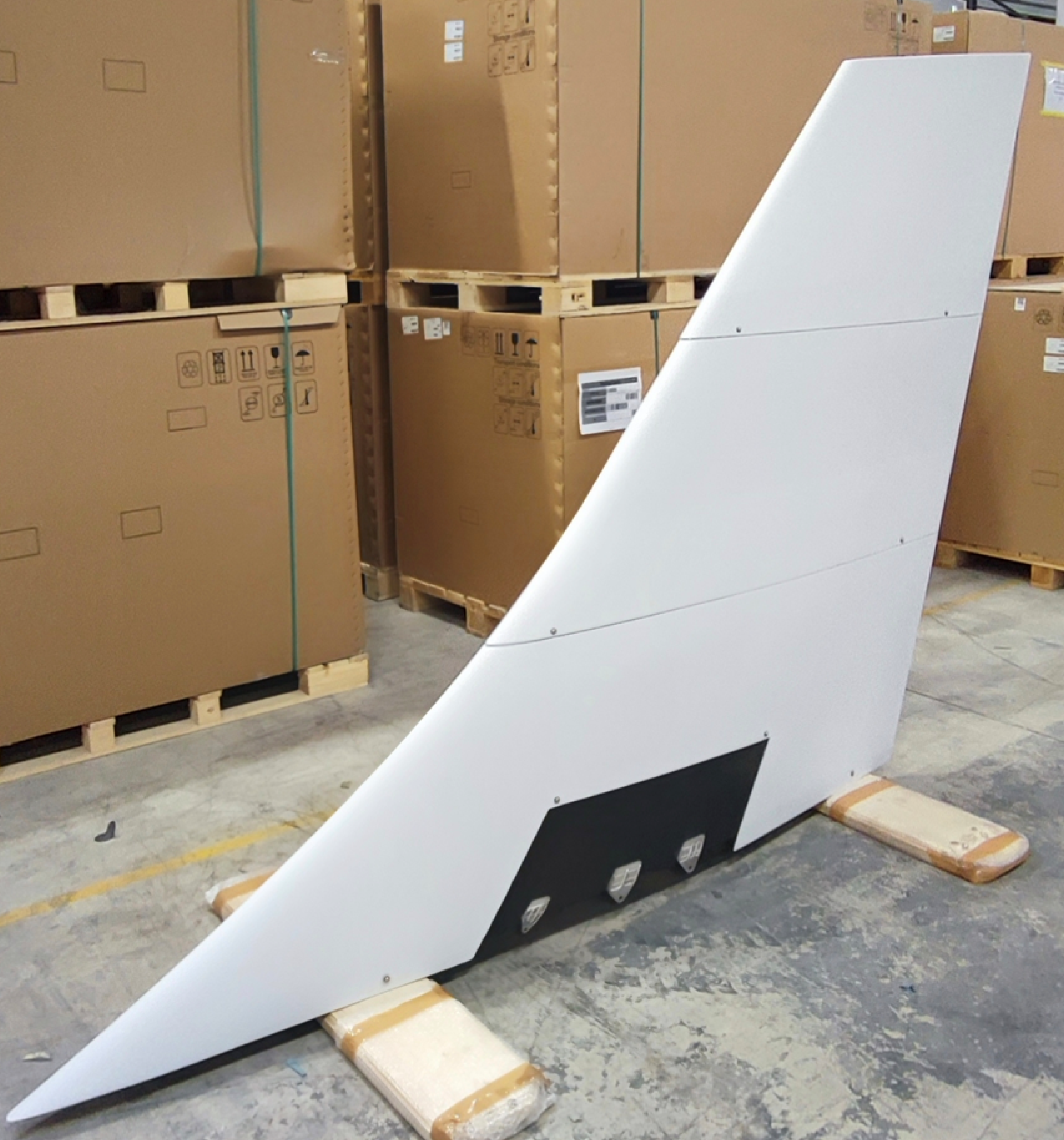 Figura 6. Dimostratore finale del progetto Mimosa durante le fasi di completamento. Il componente è una riproduzione in scala 1:3 dello stabilizzatore verticale di un velivolo di media taglia per trasporto passeggeri, in cui si notano i collegamenti metallici con la fusoliera, integrati mediante le giunzioni “Mimosa”