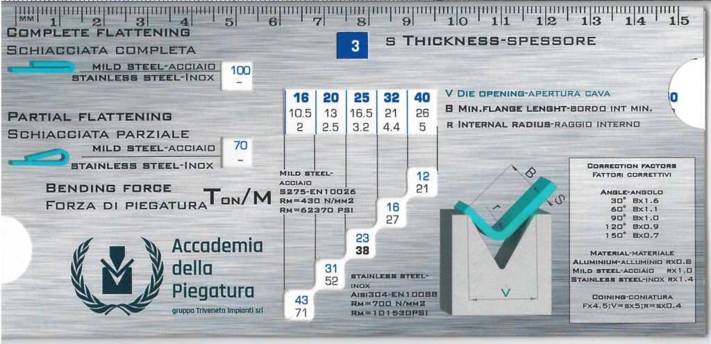 - Usare il regolo di piegatura (Figura 1) che ci darà un’indicazione preliminare, per poter fare una prima valutazione. Infatti, a seconda della cava scelta, ci darà indicazioni sul bordo minimo e forza necessaria per la piegatura (espresse in tonnellate necessarie a piegare un metro). Nei casi dove la forza risulta al limite, vedere il punto 2.