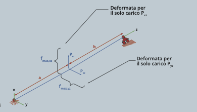 In ciascuno dei due piani (xz e yz) si calcola la massima “freccia”, mediante la seguente espressione: