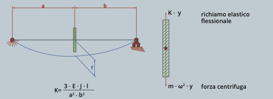Con riferimento alla figura 2, nella quale viene anche indicata la formula per il calcolo della rigidezza dell’albero, la condizione critica per la velocità angolare di rotazione si ottiene uguagliano il richiamo elastico alla forza centrifuga, da cui si ottiene: