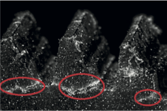 A partire dalla coppia massima a rottura, vengono determinate le coppie da utilizzare per l’esecuzione delle prove necessarie alla definizione della curva di fatica. È importante garantire che le impostazioni di coppia e velocità di rotazione conducano a rotture per flessione (figura 6) e non ad altre modalità di cedimento predominanti, quali l’usura. Tutte le prove sono condotte a una temperatura costante di 30 °C. Il banco prova è dotato di strumentazione in grado di rilevare con precisione il cedimento del dente dell’ingranaggio, consentendo l’arresto immediato della prova.