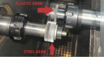 Figura 3. Dettaglio della coppia di ingranaggi con ingranaggio conduttore in acciaio e ingranaggio condotto in plastica