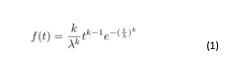 La distribuzione di Weibull è una distribuzione di probabilità continua ampiamente utilizzata in diversi ambiti, tra cui l’ingegneria dell’affidabilità, l’analisi di sopravvivenza, la meteorologia e, in generale, in tutti quei contesti in cui è necessario modellare la durata di vita di fenomeni o dispositivi [8]. Essa risulta particolarmente adatta per l’analisi dei “life data” (dati relativi alla durata di vita degli oggetti). La funzione di densità di probabilità (PDF) della distribuzione di Weibull è espressa come segue: