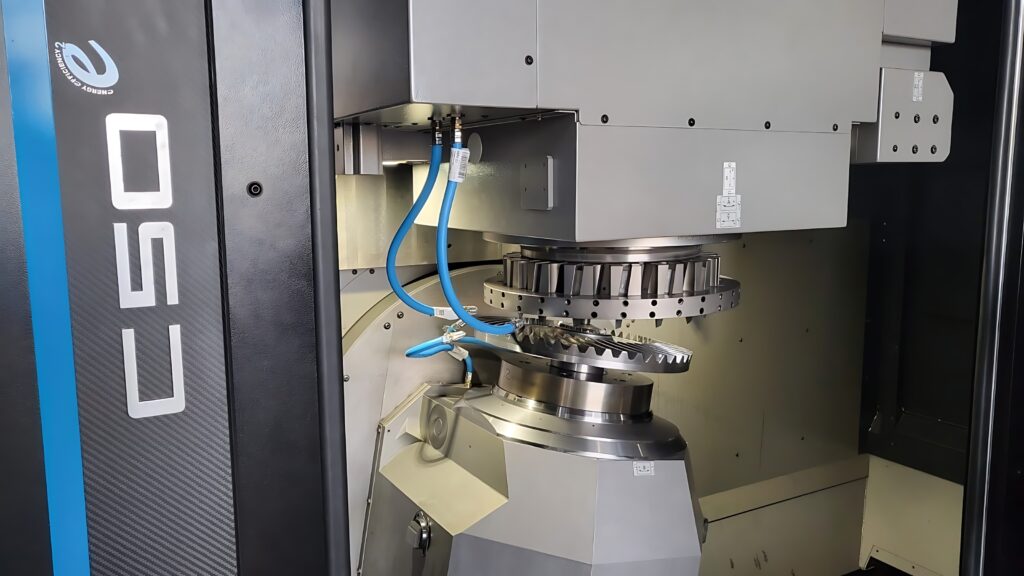 «Si inserisce così in modo complementare rispetto alla G80 – aggiunge Cesana – macchina orientata a lavorazioni di maggiore impegno, con diametri pezzo fino a 800 mm e una larghezza fascia massima di 125 mm»A completare il reparto, la C50 consente il taglio di ingranaggi conici con diametri pezzo nell’ordine dei 500 mm, con una corsa utile di taglio compresa indicativamente tra 80 e 90 mm.