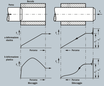 In questo caso, la conoscenza della forza esercitata al montaggio è anche indicativa della capacità dell’accoppiamento di trasmettere la coppia desiderata. La figura 3 mostra l’andamento della forza assiale nel calettamento e nello scalettamento.